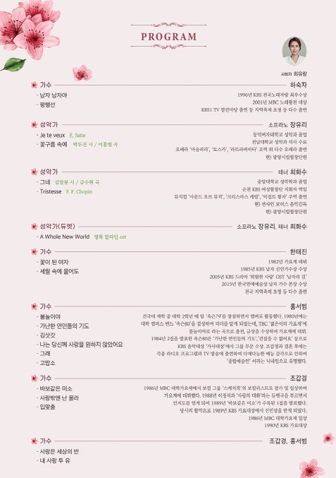À½¾Çȸ´Â '¼¼¿ù ¼Ó¿¡ ¹°¾îµµ', '²ÉÀÌ µÈ ¿©ÀÚ', µðÁî´Ï¿µÈ OST'A whole New World', 'Je te veux(±×´ë¸¦ ¿øÇØ¿ä)', 'ºÒ³îÀ̾ß', '¹Ùº¸°°Àº ¹Ì¼Ò', '»ç¶û¹Û¿£ ³ ¸ô¶ó', '³» »ç¶û ÅõÀ¯' µî ´Ùä·Ó°Ô ±¸¼ºÇß´Ù.