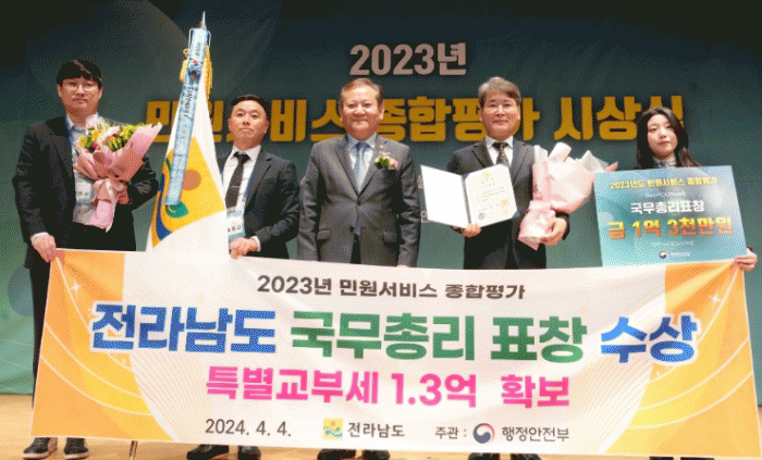 Àü³²µµ´Â ¡®¹Î¿ø¼ºñ½º Á¾ÇÕÆò°¡¡¯ °á°ú 2021³â, 2022³â ¿¬¼Ó ¡®³ª¡¯ µî±Þ¿¡ ¸Ó¹°´Ù°¡ 2023³â¿¡ ÃÖ¿ì¼ö ±â°üÀÎ ¡®°¡¡¯ µî±ÞÀ¸·Î ¿Ã¶ó ±¹¹«ÃѸ® ±â°üǥâÀ» ¼ö»óÇß´Ù.