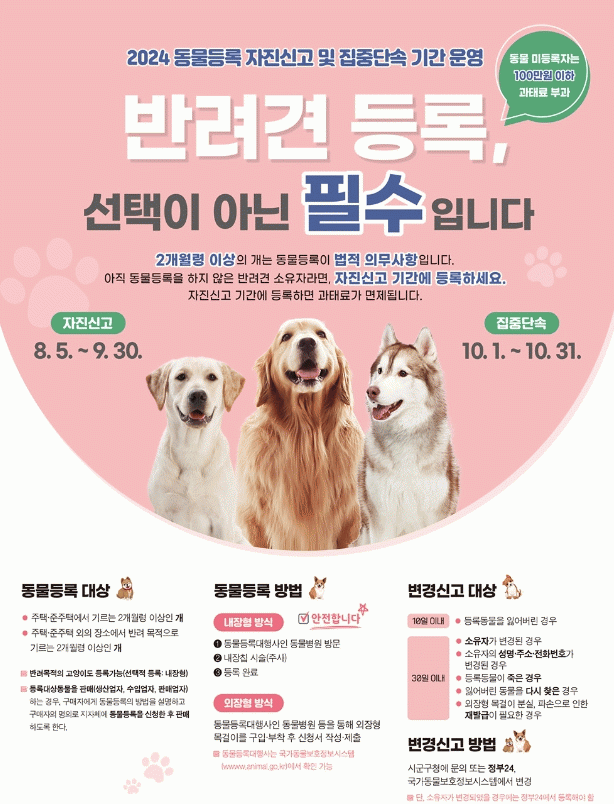 µ¿¹°µî·ÏÀº ´ëÇà ±â°üÀ¸·Î ÁöÁ¤µÈ °¡±î¿î µ¿¹°º´¿ø µî¿¡ ¹æ¹®ÇØ ¼Õ½±°Ô ÁøÇàÇÒ ¼ö ÀÖÀ¸¸ç, º¯°æ ½Å°í´Â ¡®±¹°¡µ¿¹°º¸È£Á¤º¸½Ã½ºÅÛ(www.animal.go.kr)¡¯°ú ¡®Á¤ºÎ 24¡¯ µîÀ» ÅëÇØ ¿Â¶óÀÎÀ¸·Îµµ °¡´ÉÇÏ´Ù.