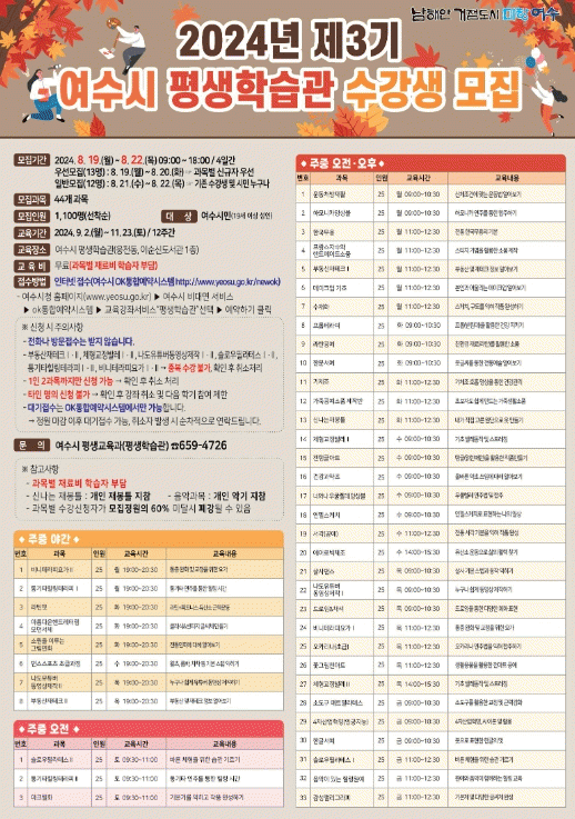 ¿©¼ö½Ã Æò»ýÇнÀ°ü¿¡¼ ¿À´Â 19ÀϺÎÅÍ Á¦3±â ¡®Á¤±Ô ÇÁ·Î±×·¥¡¯°ú ¡®ÀÚÀ¯ °ø¸ð °Á¡¯ ¼ö°»ýÀ» ¼±Âø¼ø ¸ðÁýÇÑ´Ù.