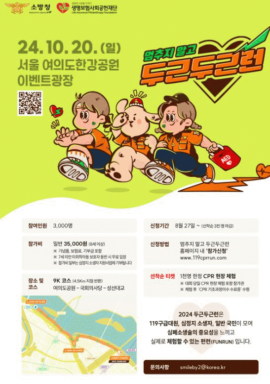 ¸¶¶óÅæ ÄÚ½º´Â ÃÑ 9km·Î 1km¸¶´Ù ½ÉÁ¤Áö ȯÀÚ ¹ß°ß ½Ã ÇÊ¿äÇÑ ½ÉÆó¼Ò»ý¼ú ´Ü°è¸¦ ÇнÀÇÒ ¼ö ÀÖ´Â ÆÝ·±(FUN RUN) Çü½ÄÀ¸·Î ÁøÇàµÇ¸ç, Âü°¡¸¦ ¿øÇÏ´Â ±¹¹Î ´©±¸³ª Âü¿© °¡´ÉÇÏ´Ù.