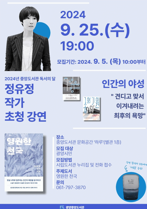 Á¤À¯Á¤ ÀÛ°¡ÀÇ °¿¬¿¡ Âü¼®ÇÏ±æ ¿øÇÏ´Â »ç¶÷Àº 9¿ù 5ÀÏ ¿ÀÀü 10½ÃºÎÅÍ ½Ã¸³µµ¼°ü ´©¸®ÁýÀ» ÅëÇØ ½Åû Á¢¼öÇϰųª Áß¾Óµµ¼°ü¿¡ ÀüÈ·Î ½ÅûÇÒ ¼ö ÀÖ´Ù.
