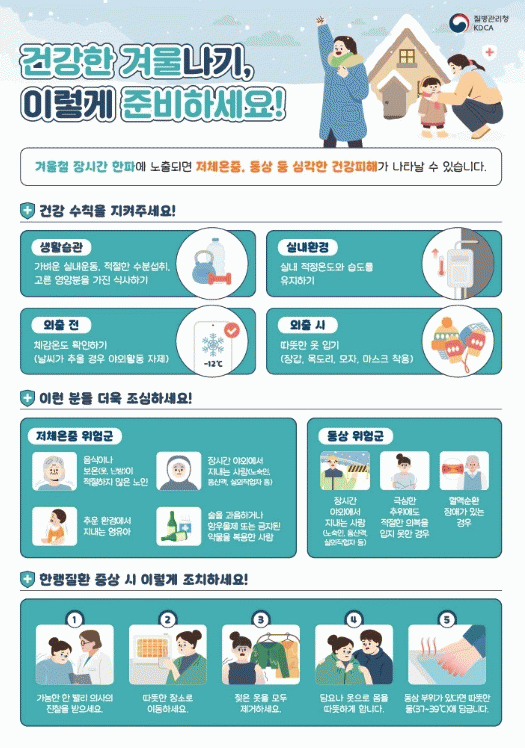°©ÀÛ½º·¯¿î ÃßÀ§´Â ½Åü ÀûÀÀ·ÂÀÌ ¶³¾îÁö¸é¼ ÇÑ·©Áúȯ¿¡ Ãë¾àÇÒ ¼ö ÀÖ¾î ¡ã¿ÜÃâ Àü ³¯¾¾ Á¤º¸ È®ÀÎ, ÇÑÆÄ ½Ã ¾ß¿ÜȰµ¿ ÀÚÁ¦ ¡ã¿ÜÃ⠽à ¾ãÀº ¿Ê °ãÃÄ ÀÔ±â, Àå°©¡¤¸ñµµ¸®¡¤¸ðÀÚ¡¤¸¶½ºÅ© Âø¿ë ¡ã»ýȰ½À°üÀ¸·Î °¡º¿î ½Ç³»¿îµ¿, ÀûÀýÇÑ ¼öºÐ ¹× ¿µ¾çºÐ ¼·Ãë ¡ã½Ç³»È¯°æÀº ÀûÁ¤ ¿Âµµ¡¤½Àµµ À¯Áö µî ¿¹¹æ¼öÄ¢À» Àß ÁöÄÑ¾ß ÇÑ´Ù.