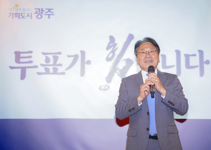 ° ½ÃÀåÀº ¡°±¤ÁÖ ÅõÇ¥À² 92.5%¶ó´Â ºÒ°¡´ÉÇÑ ²ÞÀ» ³»°É°í ±¤ÁÖ½Ã¿Í ±³À°Ã», 5°³ ÀÚÄ¡±¸°¡ ¿½ÉÈ÷ ¶Ù°í ÀÖ´Ù. ¿ì¸®´Â Àΰ£À̱⿡ »·È÷ º¸ÀÌ´Â ºÒ°¡´ÉÀÇ ±æÀ» °É¾î°£´Ù. Å« ²ÞÀ» ²Ü¼ö·Ï ±ú¾îÁø Á¶°¢µµ Å« ¹ýÀÌ´Ù¡±¸ç ¸ñÇ¥ ´Þ¼ºÀ» ´ÙÁüÇß´Ù.