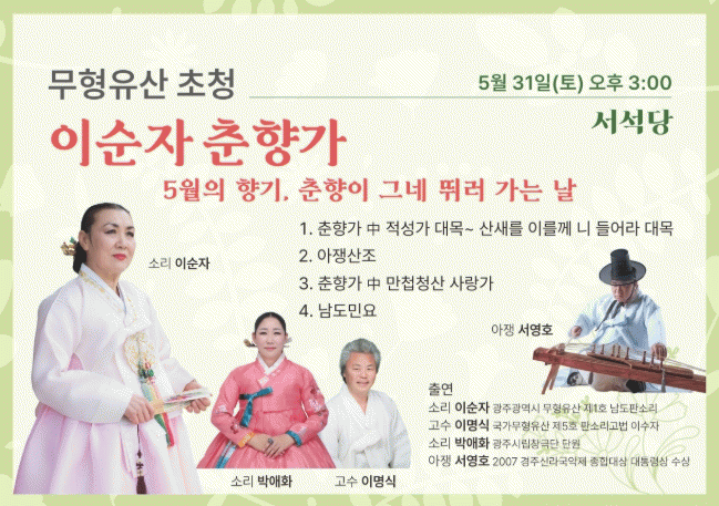 [ÀÚÄ¡Àú³Î]±¤ÁÖ¹®ÈÀç´Ü ÀüÅ빮ȰüÀº ¿À´Â 5¿ù 31ÀÏ(Åä) Åä¿ä »ó¼³°ø¿¬(¿ÀÈÄ 3½Ã, 8ȸÂ÷)°ú Èñ°æ·ç dz·ù¼Ò¸®(¿ÀÈÄ 4½Ã, 6ȸÂ÷) ¹«´ë¸¦ ¼±º¸ÀδÙ.