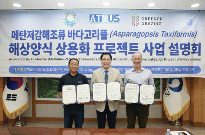 [ÀÚÄ¡Àú³Î]¿Ïµµ±ºÀº Áö³ 6¿ù 5ÀÏ ÇØ¾ç ºí·çÅ×Å© ½ºÅ¸Æ®¾÷ AT4US Korea¿Í ±Û·Î¹ú ¹Ù´Ù°í¸®Ç® ¿¬±¸ ±â¾÷ Greener Grazing LLC¿Í ÅäÁ¾ ¹Ù´Ù°í¸®Ç®(Asparagopsis taxiformis)À» Ȱ¿ëÇÑ ¾ç½Ä »ê¾÷ ¹ßÀü°ú Ãà»ê ¸Þź Àú°¨ ź¼Ò Á߸³ ½ÇÇöÀ» À§ÇÑ 3ÀÚ °£ ¾÷¹« Çù¾àÀ» ü°áÇß´Ù.