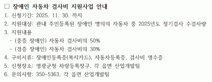 ¿µ±¤±º, Àå¾ÖÀÎ ¼ÒÀ¯ ÀÚµ¿Â÷ °Ë»çºñ Áö¿ø