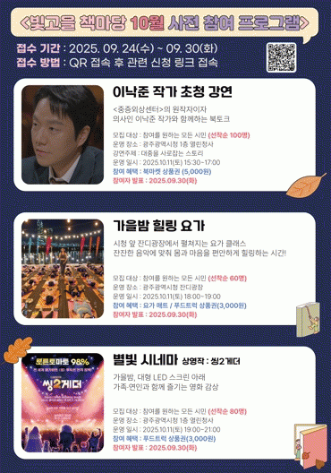 ÇÑÆí ¡®ºû°íÀ» Ã¥¸¶´ç¡¯ ÀϺΠÇÁ·Î±×·¥Àº »çÀü ¿¹¾àÁ¦·Î ¿î¿µµÇ¸ç, ±¤ÁÖ¹®È¿¹¼úÅëÇÕÇ÷§Æû ¡®µð¾î¸¶À̱¤ÁÖ¡¯¸¦ ÅëÇØ ½Åû °¡´ÉÇÏ´Ù. ÀÚ¼¼ÇÑ »çÇ×Àº ±¤Áֽà ¹®ÈÀ¯»êÀÚ¿ø°ú·Î ¹®ÀÇÇÏ¸é µÈ´Ù.