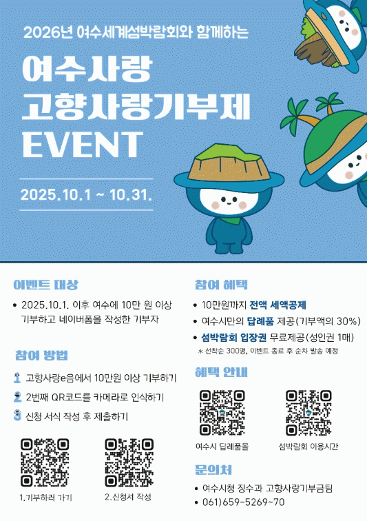 [ÀÚÄ¡Àú³Î]¿©¼ö½Ã´Â 10¿ù ÇÑ ´Þ°£ 10¸¸ ¿ø ÀÌ»ó °íÇâ»ç¶û±âºÎ¿¡ Âü¿©ÇÑ ±âºÎÀÚ ¼±Âø¼ø 300¸í¿¡°Ô ¡®2026¿©¼ö¼¼°è¼¶¹Ú¶÷ȸ¡¯ ÀÔÀå±ÇÀ» ÁõÁ¤Çϴ Ưº° À̺¥Æ®¸¦ ÁøÇàÇϰí ÀÖ´Ù°í ¹àÇû´Ù.