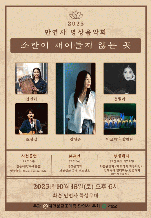ȼø±ºÀÌ ÁÖÃÖÇÏ°í ¸¸¿¬»ç°¡ ÁÖ°üÇÏ´Â À̹ø »ê»çÀ½¾Çȸ´Â 1208³â ¼³¸³µÈ õ³â°íÂû ¸¸¿¬»çÀÇ ¿îÄ¡ Àִ dz°æÀ» ¹è°æ »ï¾Æ ¡®¼Ò¶õÀÌ »õ¾îµéÁö ¾Ê´Â °÷¡¯À̶õ ÁÖÁ¦ÀÇ ¸í»óÀ½¾Çȸ¸¦ ÅëÇØ ¸¶À½ÀÚ¸®¸¦ µé¿©´Ùº¸´Â ½Ã°£À¸·Î ±âȹµÆ´Ù.