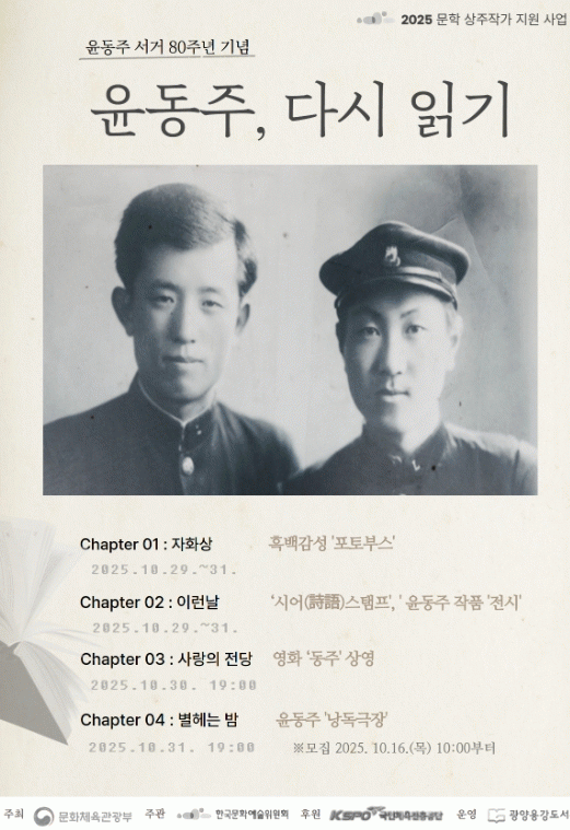 [ÀÚÄ¡Àú³Î]±¤¾ç¿ë°µµ¼°üÀÌ À±µ¿ÁÖ ¼°Å 80ÁÖ³âÀ» ¸Â¾Æ ¿À´Â 10¿ù 29ÀϺÎÅÍ 31ÀϱîÁö ±×ÀÇ »î°ú ÀÛǰ¼¼°è¸¦ ´Ù¾çÇÑ ¹æ½ÄÀ¸·Î Á¶¸íÇÏ´Â ÇÁ·Î±×·¥ 'À±µ¿ÁÖ, ´Ù½Ã Àбâ'¸¦ ¿î¿µÇÑ´Ù.
