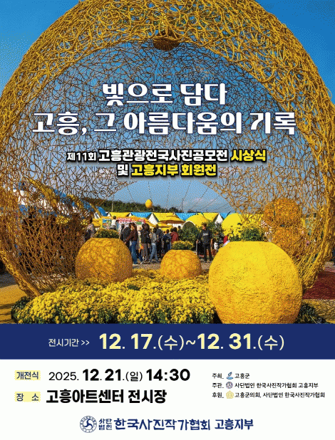 [ÀÚÄ¡Àú³Î]°íÈﱺÀº ¿À´Â 12¿ù 17ÀϺÎÅÍ 31ÀϱîÁö °íÈï¾ÆÆ®¼¾ÅÍ¿¡¼ Á¦11ȸ °íÈï°ü±¤ Àü±¹ »çÁø°ø¸ðÀü Àü½Ãȸ¸¦ °³ÃÖÇÑ´Ù°í ¹àÇû´Ù.