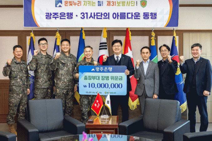 [ÀÚÄ¡Àú³Î]±¤ÁÖÀºÇàÀº 12ÀÏ, ¼³ ¸íÀýÀ» ¾ÕµÎ°í Áö¿ª¹æÀ§»ç´ÜÀÎ Á¦31º¸º´»ç´ÜÀ» ¹æ¹®ÇØ À§¹®±Ý 1õ¸¸ ¿øÀ» Àü´ÞÇß´Ù°í ¹àÇû´Ù. À̹ø ¹æ¹®Àº ¸íÀý ±â°£¿¡µµ Áö¿ª ¹æÀ§¸¦ À§ÇØ ¸ÃÀº ¹Ù ÀÓ¹«¸¦ ¼öÇàÇϰí ÀÖ´Â À庴µé¿¡°Ô °¨»çÀÇ ¸¶À½À» ÀüÇϰí, Áö¿ª ´ëÇ¥ ±ÝÀ¶±â°üÀ¸·Î¼ Áö¿ª»çȸ¿Í ÇÔ²²ÇÏ´Â ³ª´®ÀÇ °¡Ä¡¸¦ ½ÇõÇϱâ À§ÇØ ¸¶·ÃµÆ´Ù.