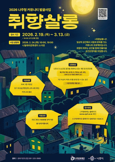 ³ªÁÖ¹®ÈÀç´ÜÀÌ 2026 ³ªÁÖÇü Ä¿¹Â´ÏƼ ¹ß±¼»ç¾÷ ¡®ÃëÇâ»ì·Õ¡¯ÀÇ °ø°£¿î¿µÀÚ¸¦ ¸ðÁýÇÑ´Ù.
