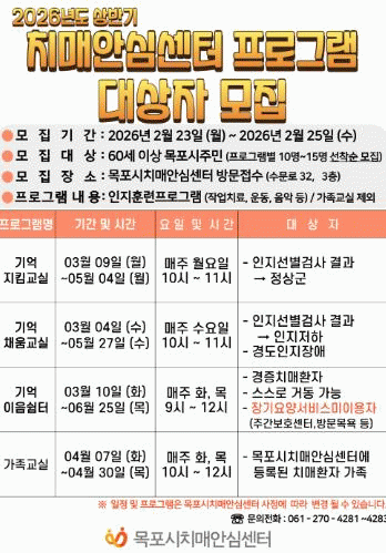 [ÀÚÄ¡Àú³Î]¸ñÆ÷½Ã Çϴ纸°ÇÁö¼Ò Ä¡¸Å¾È½É¼¾ÅÍ´Â Áö¿ª ¾î¸£½ÅµéÀÇ Ä¡¸Å ¿¹¹æ°ú ÀÎÁö±â´É À¯Áö¸¦ À§ÇØ 2026³âµµ »ó¹Ý±â Ä¡¸Å¾È½É¼¾ÅÍ ÇÁ·Î±×·¥ ´ë»óÀÚ¸¦ ¸ðÁýÇÑ´Ù°í ¹àÇû´Ù.
