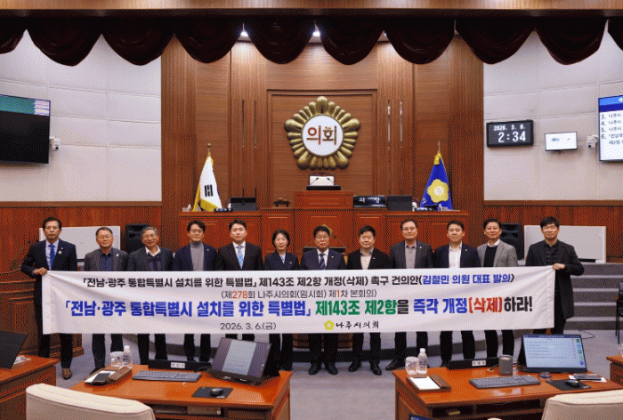 [ÀÚÄ¡Àú³Î]³ªÁÖ½ÃÀÇȸ´Â 3¿ù 6ÀÏ Á¦278ȸ ÀÓ½Ãȸ Á¦1Â÷ º»È¸ÀǸ¦ ¿°í ''Àü³²±¤ÁÖÅëÇÕÆ¯º°½Ã ¼³Ä¡¸¦ À§ÇÑ Æ¯º°¹ý' Á¦143Á¶ Á¦2Ç× »èÁ¦ Ã˱¸ °ÇÀǾÈ'À» äÅÃÇß´Ù.