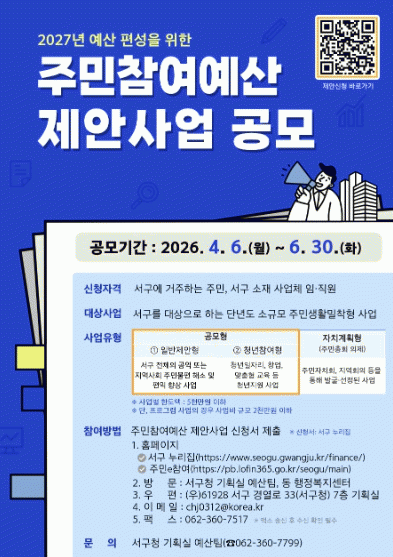 [ÀÚÄ¡Àú³Î]±¤ÁÖ±¤¿ª½Ã ¼±¸°¡ ½ÇÁúÀûÀÎ ÁÖ¹ÎÁÖ±Ç °È¸¦ À§ÇØ ¡®ÁÖ¹ÎÂü¿©¿¹»ê Á¦¾È»ç¾÷ °ø¸ð¡¯¸¦ 6¿ù 30ÀϱîÁö ÁøÇàÇÑ´Ù. À̹ø °ø¸ð´Â ³»³âµµ ¿¹»ê¿¡ ¹Ý¿µÇÒ ÁֹΠÁ¦¾È»ç¾÷À» ¸ðÁýÇÏ´Â °ÍÀ¸·Î ÀÌ´Þ 6ÀϺÎÅÍ Á¢¼ö¸¦ ½ÃÀÛÇÑ´Ù.