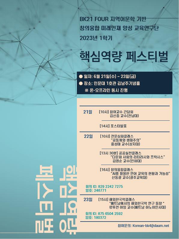 [ÀÚÄ¡Àú³Î]Àü³²´ëÇб³ ±¹¾î±¹¹®Çаú BK21 FOUR Áö¿ª¾î¹®ÇÐ ±â¹Ý âÀÇÀ¶ÇÕ ¹Ì·¡ÀÎÀç ¾ç¼º ±³À°¿¬±¸´ÜÀÌ 6¿ù 21ÀϺÎÅÍ 23ÀϱîÁö »çÈê°£ ¡®Çٽɿª·® Æä½ºÆ¼¹ú¡¯À» ¿Â¡¤¿ÀÇÁ¶óÀÎÀ¸·Î °³ÃÖÇÑ´Ù.