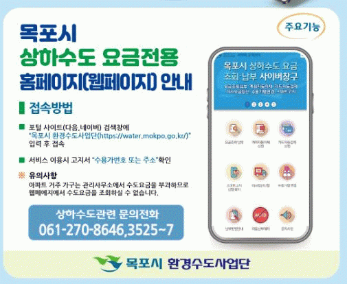 ¸ð¹ÙÀÏ À¥ÆäÀÌÁö ¼ºñ½º´Â ½º¸¶Æ®Æù¿¡¼ ¸ñÆ÷½Ã ȯ°æ¼öµµ»ç¾÷´Ü ȨÆäÀÌÁö¿¡ Á¢¼ÓÇØ »óÇϼöµµ ¿ä±Ý °íÁö¼¿¡ ±âÀçµÈ ¼ö¿ë°¡ ¹øÈ£³ª ÁÖ¼Ò¸¦ ÀÔ·ÂÇϸé ÀÌ¿ëÇÒ ¼ö ÀÖ´Ù.